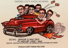 This label commemorates the 55th anniversary of Greg's DCHS Senior class trip to Lake Meade in 1964. Sanctioned by the school, teachers and students all had a great outing. The car is depicted in better shape than it probably was-- it was a cold chisel convertible conversion of a junk yard car!